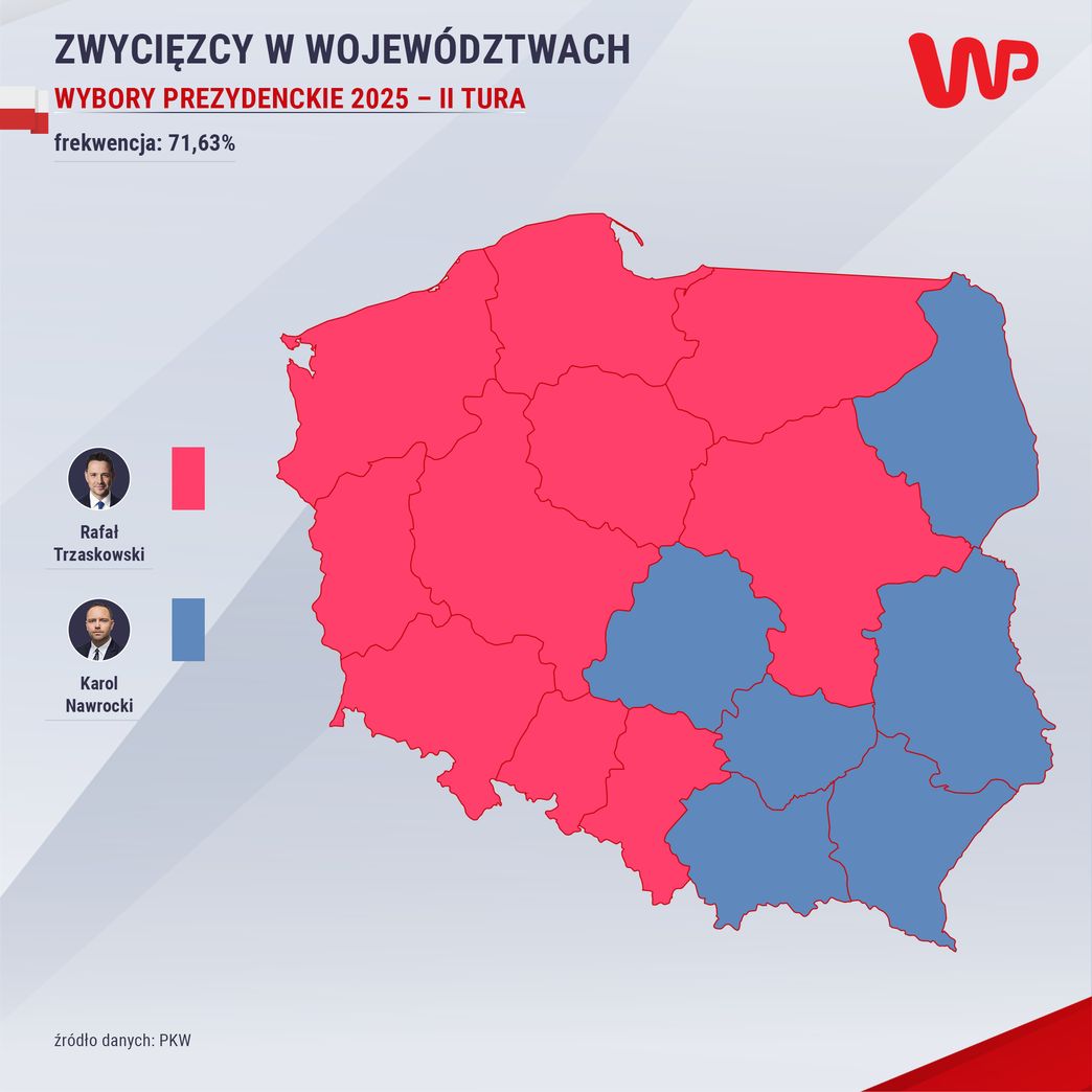 У виборах 2025 року ця різниця була ще меншою. Кароль Навроцький здобув 10 606 638 голосів, що дало йому 50,89 % підтримки. І хоч Рафал Тшасковський покращив свій результат п’ятирічної давнини на понад 200 тисяч голосів, але цього не вистачило для перемоги. Він отримав 10 237 177 голосів, тобто 49,11 % підтримки. На цьогорічних президентських виборах різниця між кандидатами склала 369 461 голос.