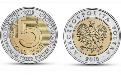 Національний банк Польщі вводить у обіг монету номіналом 5 злотих із написом «100-річчя відновлення незалежності Польщі». Тираж монет символічно відповідає числу громадян країни і становить 38 млн 420 тис.