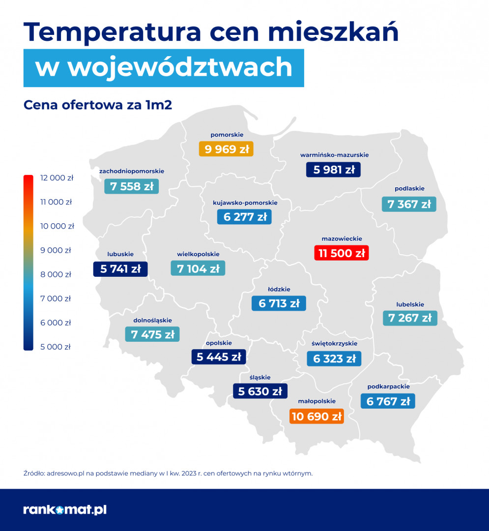 Серед столиць воєводств, окрім Варшави, найдорожчими є Гданськ (11,8 тис. злотих за квадратний метр), Краків (11,7 тис.) і Вроцлав (10,6 тис.), а найдешевшими – Гожув-Великопольський (6,46 тис. злотих за квадратний метр), Бидгощ (6963 злотих), Зелена Гура (6995 злотих) і Лодзь (7,2 тис.).