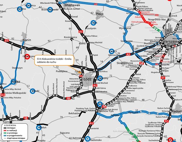 Тепер водії можуть користуватися повним кільцем навколо Лодзської агломерації, яке складається з ділянок автомагістралей A1 і A2 та швидкісних магістралей S8 і S14.