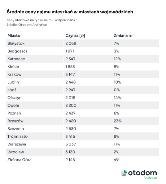 Найдорожчою лишається Варшава, де середня орендна плата становить понад 5 тис. злотих на місяць. Середня ціна за оренду житла в Гданську, Кракові та Вроцлаві залишається на рівні понад 3 тис. злотих на місяць. У Катовіце, Любліні, Ряшеві та Познані, тобто в містах, де частка студентів серед усього населення найвища, оренда житла коштує 2,4 тис. злотих на місяць.