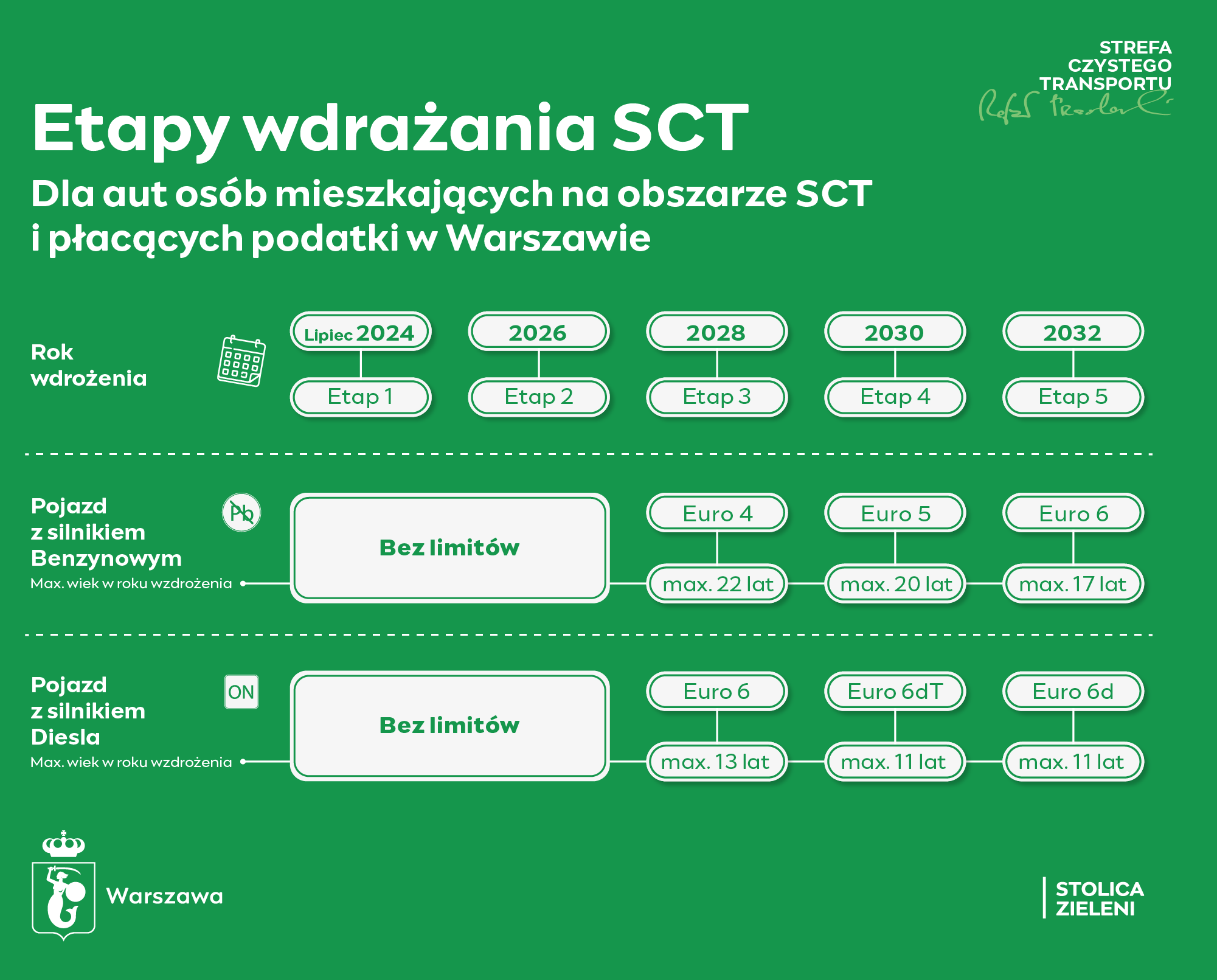 Органи місцевого самоврядування можуть розширити перелік транспортних засобів, дозволених для руху в ЗЧТ, включаючи, наприклад, автомобілі з двигунами внутрішнього згоряння, які відповідають обраним стандартам викиду вихлопних газів. Така практика здійснюватиметься у Варшаві та Кракові. У столиці зони чистого транспорту запроваджуватимуться поетапно. Перша із п’яти з’явиться в липні 2024 р. ЗЧТ охоплюватиме повністю Середмістя, Жолібож і Прагу-Північ, а також майже всю Охоту та Прагу-Південь, більшу частину Мокотува та половину Волі. Пізніше, кожні два роки, вимоги до викидів вихлопних газів будуть посилюватися.