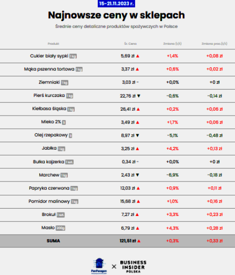Сьогодні вартість споживчого кошика становить 121,51 злотого. Саме стільки поляки сплачують за мінімальний набір найнеобхідніших для повноцінного життя людини продуктів харчування. Такі цифри наводить портал Business Insider на підставі аналізу статистичних даних мобільного додатку PanParagon. Це означає, що з 15 до 21 листопада ціни порівняно з попереднім тижнем зросли на 0,3 %.