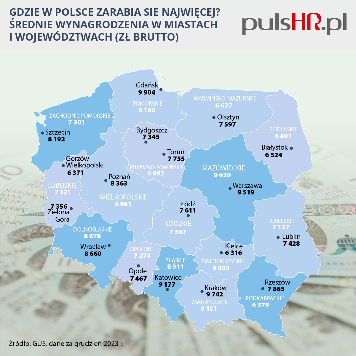 - Вроцлав – 8660,07 злотого (Нижньосілезьке воєводство – 8677,67 злотого),