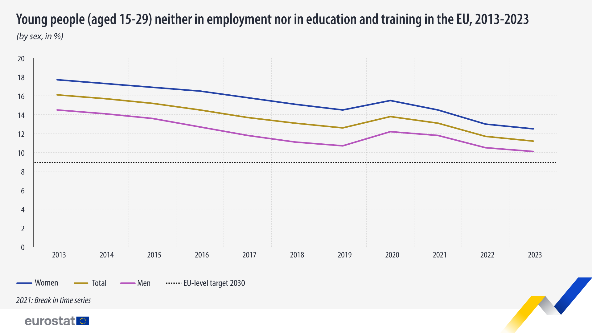 Згідно з даними Євростату, у 2023 р. 11,2 % молодих людей Євросоюзу у віці від 15 до 29 років не працювали і не навчалися, що означає зниження цього показника на 0,5 % порівняно з 2022 р.