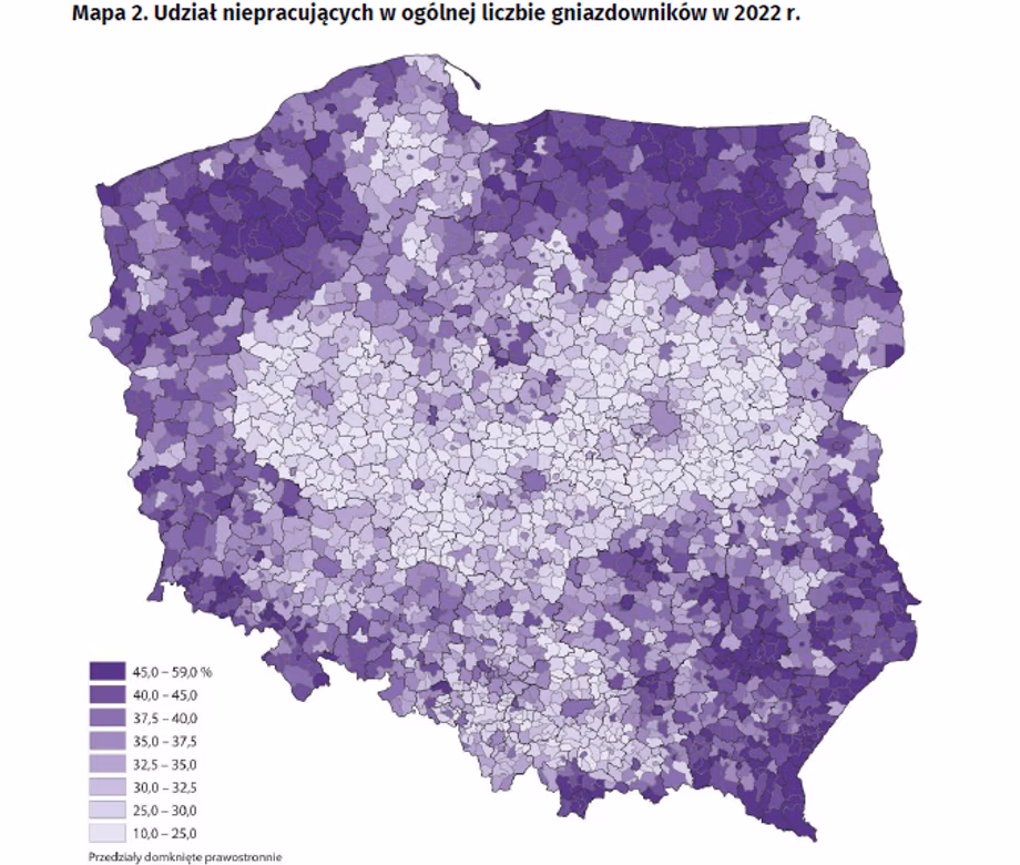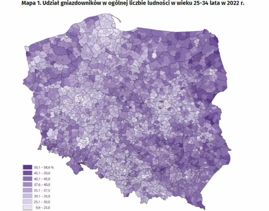 Найбільша частка таких молодих людей була зафіксована у воєводствах, які зазвичай характеризуються нижчими середніми доходами: Свєнтокшиському (41 %), Підкарпатському та Люблінському (по 39 %). Найменша (не більше як 30 %) – у заможніших воєводствах: Мазовецькому, Поморському та Нижньосілезькому.
