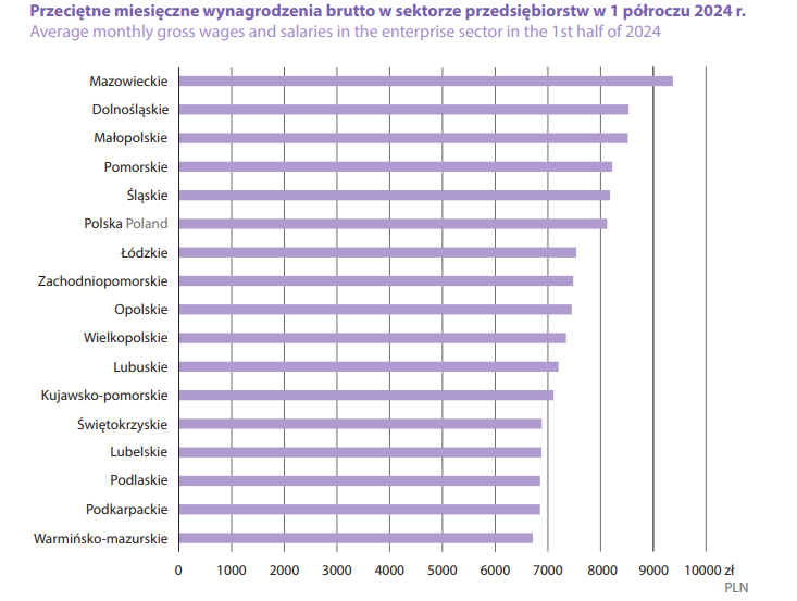 Найвищий рівень зарплат досі зберігається в Мазовецькому воєводстві (115,4 % від середнього показника у країні). Зарплати, вищі за середній рівень у країні, також зафіксовані в Нижньосілезькому (на 5 %), Малопольському (на 4,9 %), Поморському (на 1,2 %) і Сілезькому (на 0,7 %) воєводствах.