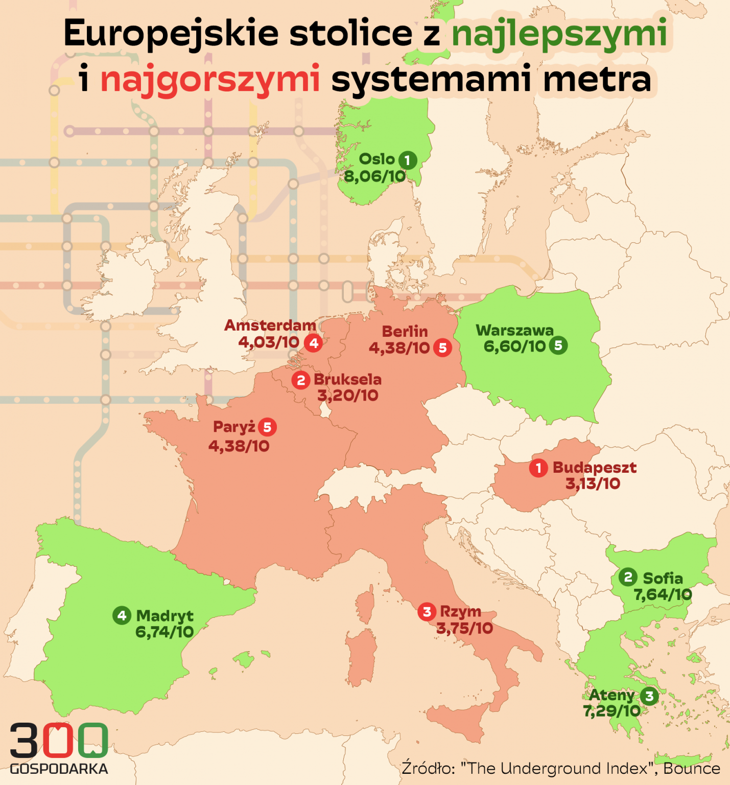 «Ми взяли до уваги низку показників: від середньої оцінки Google для кожної станції метро до таких факторів, як-от розгалуження системи метро, кількість станцій, річна кількість пасажирів і частка позитивних та негативних оцінок. Ці дані були зібрані в єдиний показник, який дозволяє нам визначити найкращі та найгірші системи метрополітенів у Європі», – розповіли автори рейтингу.