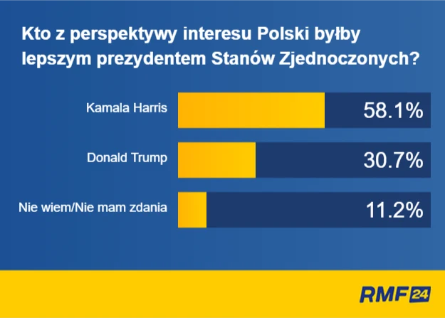 Якби на вибори прийшли лише поляки, то перемогу здобула би Камала Гарріс. 58,1 % опитаних підтримали кандидатуру демократки. Дональда Трампа вважали б корисним для Польщі трохи менш як 31 % опитаних.