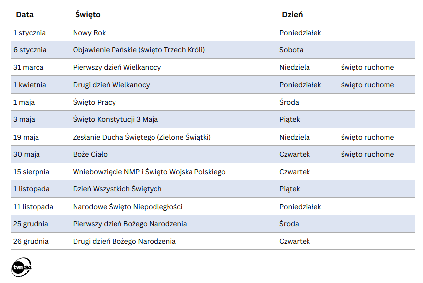 Сьогодні законодавство про вихідні дні визначає неробочими 1 січня (Новий рік), 6 січня (Свято Трьох Царів), перший і другий день Великодня, 1 травня (Свято праці), 3 травня (День Конституції З Травня), перший день Зелених свят, свято Тіла Господнього, 15 серпня (Успіння Пресвятої Діви Марії), 1 листопада (День Усіх Святих), 11 листопада (День Незалежності), 25 і 25 грудня (перший та другий день Різдва), а також усі неділі року.