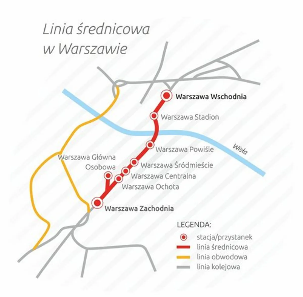 Уся трансміська залізниця з’єднує головні залізничні вокзали столиці: Варшава-Західна, Варшава-Центральна і Варшава-Східна. Будівництво цієї залізниці та тунелю під середмістям Варшави було одним із головних завдань відродженої Польщі після здобуття незалежності. Після будівництва, що тривало багато років, залізницю відкрили 2 вересня 1933 р.