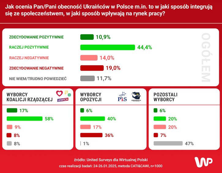 В опитуванні, проведеному на замовлення порталу WP у 2023 р., 64,4 % респондентів оцінювали присутність українців позитивно. Тоді їм поставили питання: «Як ви оцінюєте присутність українців у Польщі, зокрема те, як вони інтегруються в суспільство, як впливають на ринок праці?» Негативну думку тоді висловили 29,5 % опитаних.