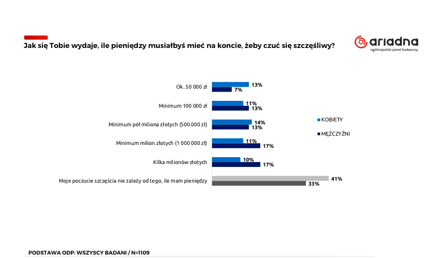 Трохи більше ніж чверть поляків (28 %) вірять, що для щастя їм потрібно щонайменше мільйон злотих. Серед них переважають чоловіки (34 % проти 21 % серед жінок).