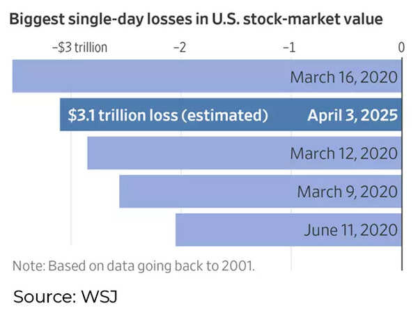 Як повідомляє Wall Street Journal, ринкова вартість компаній, що котируються на Нью-Йоркській біржі, за один день зменшилася на 3,1 трлн доларів. Основні індекси зазнали падіння на 4‒6 %. Наприклад, Dow Jones Industrial Average – на 3,98 %, Nasdaq – на 5,97 %, а S&P 500 – на 4,84 %. У всіх випадках це були найгірші одноденні падіння з 2020 р.