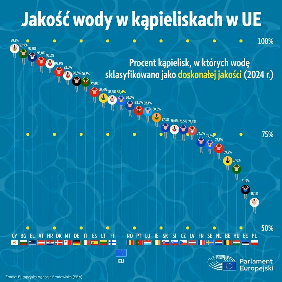 Останній звіт показує, що 85 % водойм у ЄС визнано абсолютно придатними, а 96 % відповідають мінімальним вимогам безпеки. На жаль, Польща опинилася на останньому місці в рейтингу.