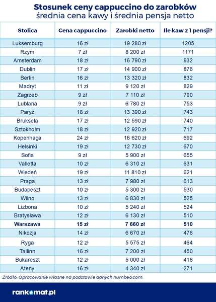 Проте капучино в Копенгагені не є таким дорогим для мешканців столиці Данії. Якщо врахувати середні заробітки (в перерахунку 16 620 злотих), виявляється, що вони можуть дозволити собі купити 692 порції кави. Для порівняння, у Варшаві за місцевими зарплатами цей показник становить 510. На фоні інших столиць Варшава є одним із дорожчих міст за цінами на каву. За одну зарплату 510 порцій капучино могли б придбати жителі Братислави, а менше 500 – Нікосії, Риги, Таллінна та Бухареста.