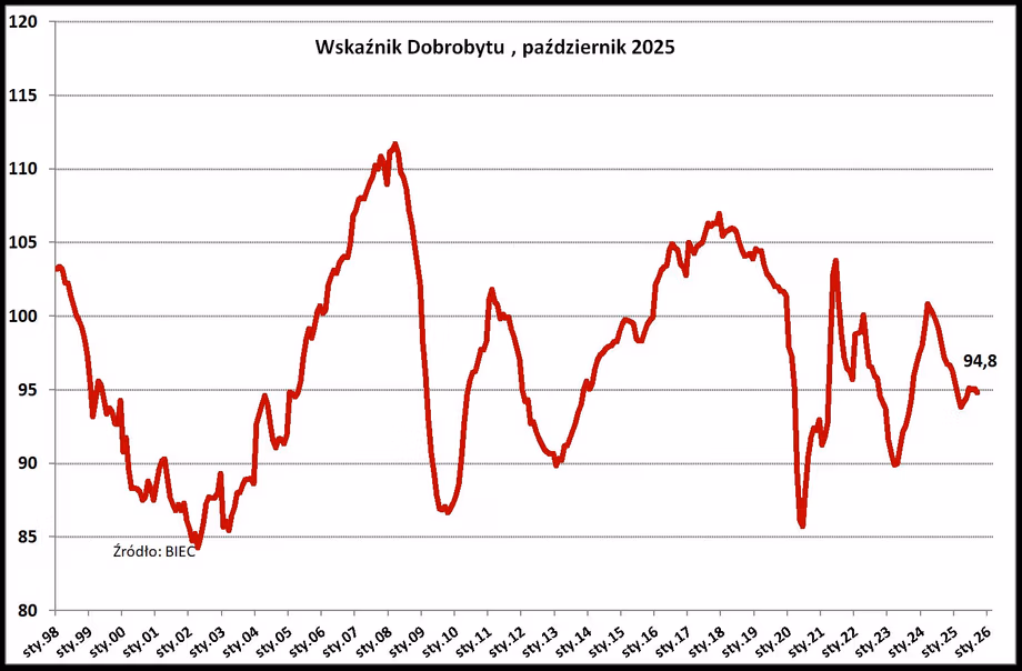 Бюро інвестицій та економічних циклів повідомило, що показник, який відображає економічний стан польського суспільства, у жовтні 2025 р. погіршився на 0,3 пункта порівняно з попереднім місяцем.