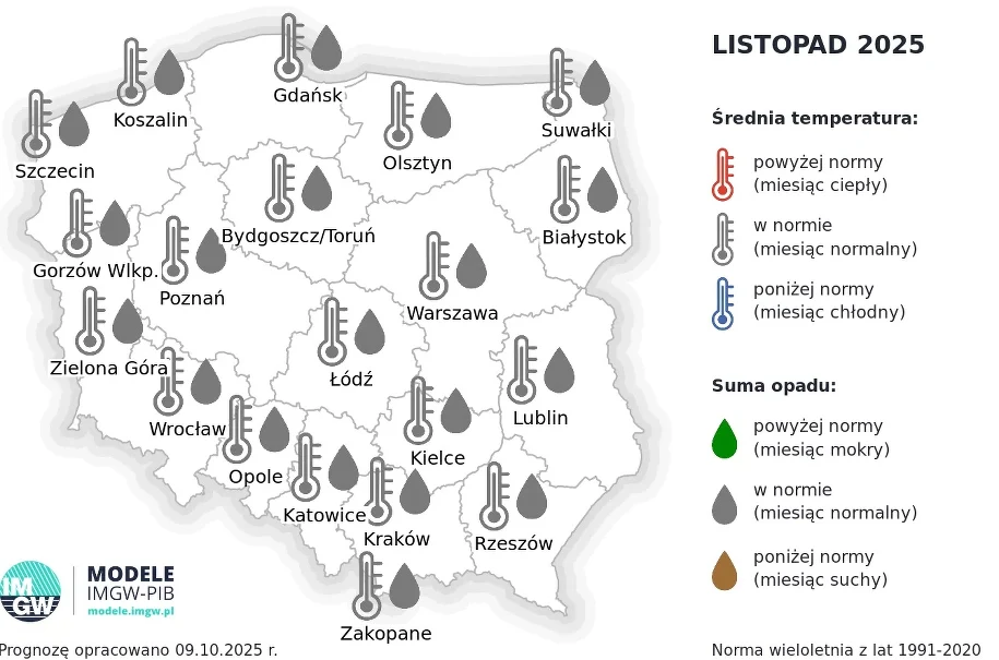 Згідно з прогнозом IMWM, і листопад, і грудень не принесуть суттєвих сюрпризів. Очікується, що середньомісячна температура і кількість опадів залишаться на типових для цього періоду рівнях. Це означає, що не очікується ні надзвичайно теплих, ні дуже морозних днів, а кількість опадів (і снігових, і дощових) відповідатиме середнім значенням за 1991–2020 рр.