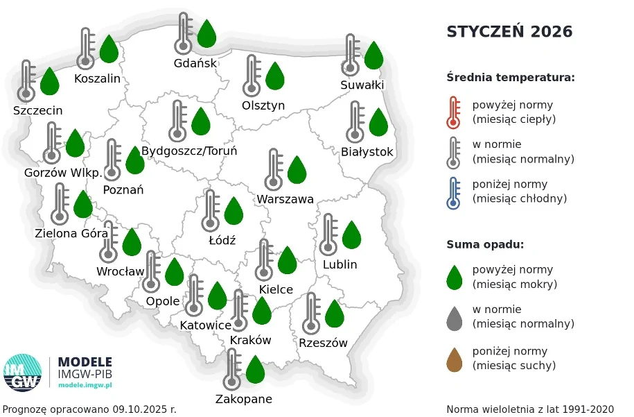 Винятком серед зимових місяців, як очікується, буде січень 2026 р. Інститут метеорології та водного господарства (IMGW) прогнозує, що хоча середні температури залишатимуться нормальними, кількість опадів у країні буде вищою за середню. Це означає, що ми можемо очікувати більше днів з опадами в січні, хоча неясно, чи випадатимуть вони переважно у вигляді снігу чи дощу. Збільшення кількості опадів може вплинути на дорожні умови та гідрологічну ситуацію в країні.