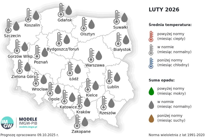 Інститут метеорології та водного господарства представив свій прогноз також на лютий 2026 р. Очікується, що середньомісячні температури в Польщі залишаться в межах багаторічної норми для 1991‒2020 рр. Це означає, що прогнозована середня температура повітря в лютому буде типовою для цього місяця, без надзвичайно сильних заморозків і незвично м’якої зими. Очікується, що температурні умови відповідатимуть середнім значенням для цього періоду, тобто буде стабільна та передбачувана погода без суттєвих відхилень від стандартних температур, які зазвичай фіксуються в лютому в Польщі.