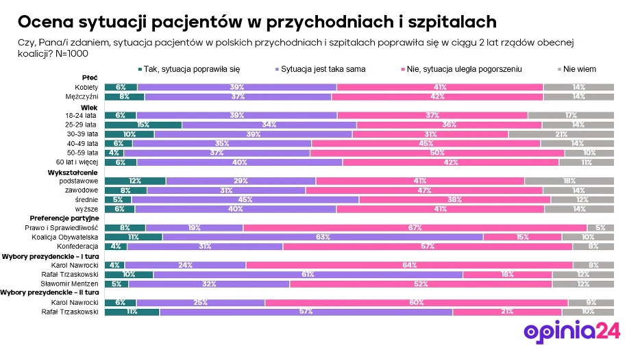 Аналіз електоральних уподобань свідчить, що найгірше зміни оцінюють виборці «Права і справедливості» ‒ 67 % з них відповіли, що становище пацієнтів погіршилося, та «Конфедерації» ‒ 57 %. Подібну думку мають ті, хто голосував на президентських виборах за Кароля Навроцького. Серед тих, хто віддав за нього голос у першому та другому турах, погіршення помітили відповідно 64 % і 60 %.