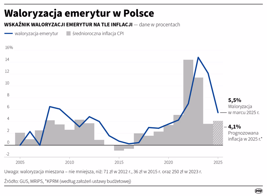 У 2026 р. також будуть проіндексовані соціальні пенсії для осіб з інвалідністю, які не можуть обходитися без сторонньої допомоги. За показником індексації в 4,88 % соціальна пенсія зросте з 1 878,91 до 1 970,60 злотого, а доплата до цієї пенсії – з 2 610,72 до 2 738,12 злотого.