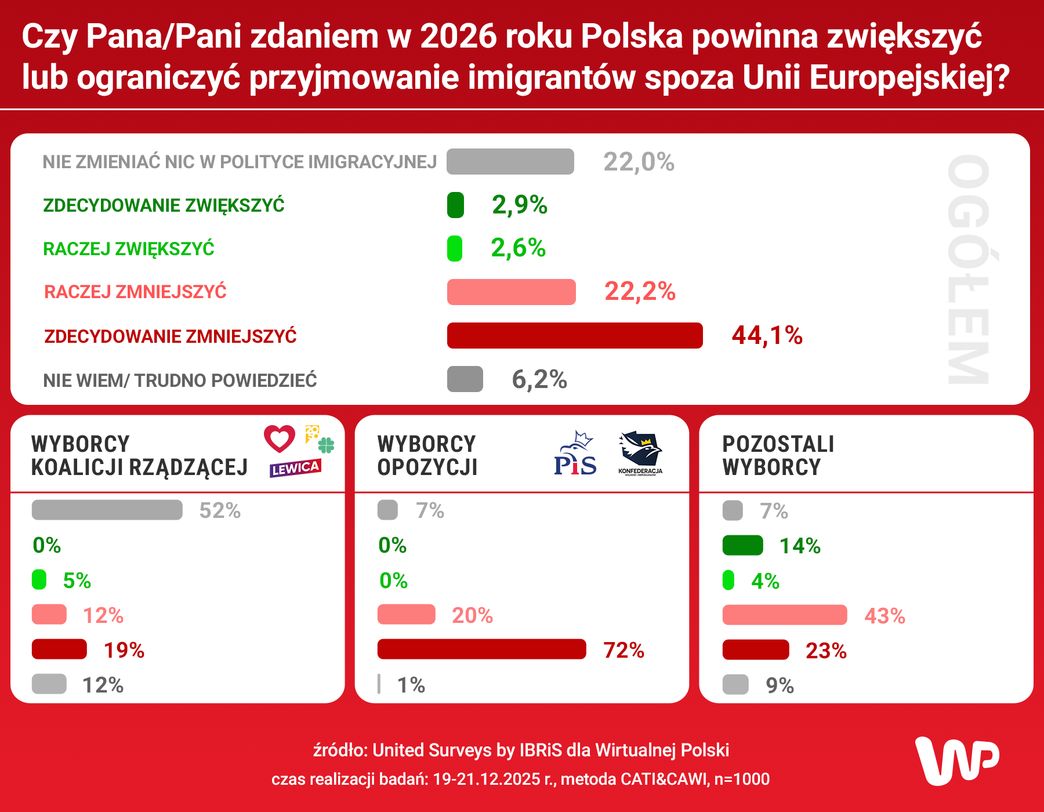 Польсько-білоруський кордон, релокація мігрантів, перевірки та міграційний пакт – у 2026 р. міграційна політика залишиться однією з найбільш гарячих тем у політичних дебатах. Під час опитування респондентів запитали, чи повинна Польща збільшити або обмежити прийом іммігрантів із-поза меж Європейського Союзу.