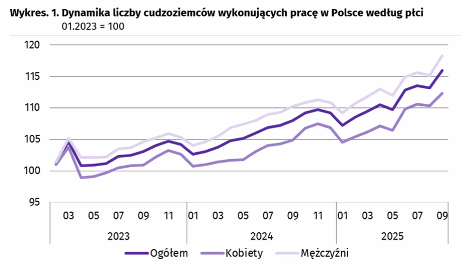 За цією інформацією, кількість осіб, народжених поза Польщею, які сьогодні працюють у Польщі, становить 1 млн 128,9 тис. Це на 2,3 % більше, ніж у серпні 2025 р., і на 7,2 % більше, ніж торік. Такої високої динаміки зростання не фіксували з травня 2023 р.